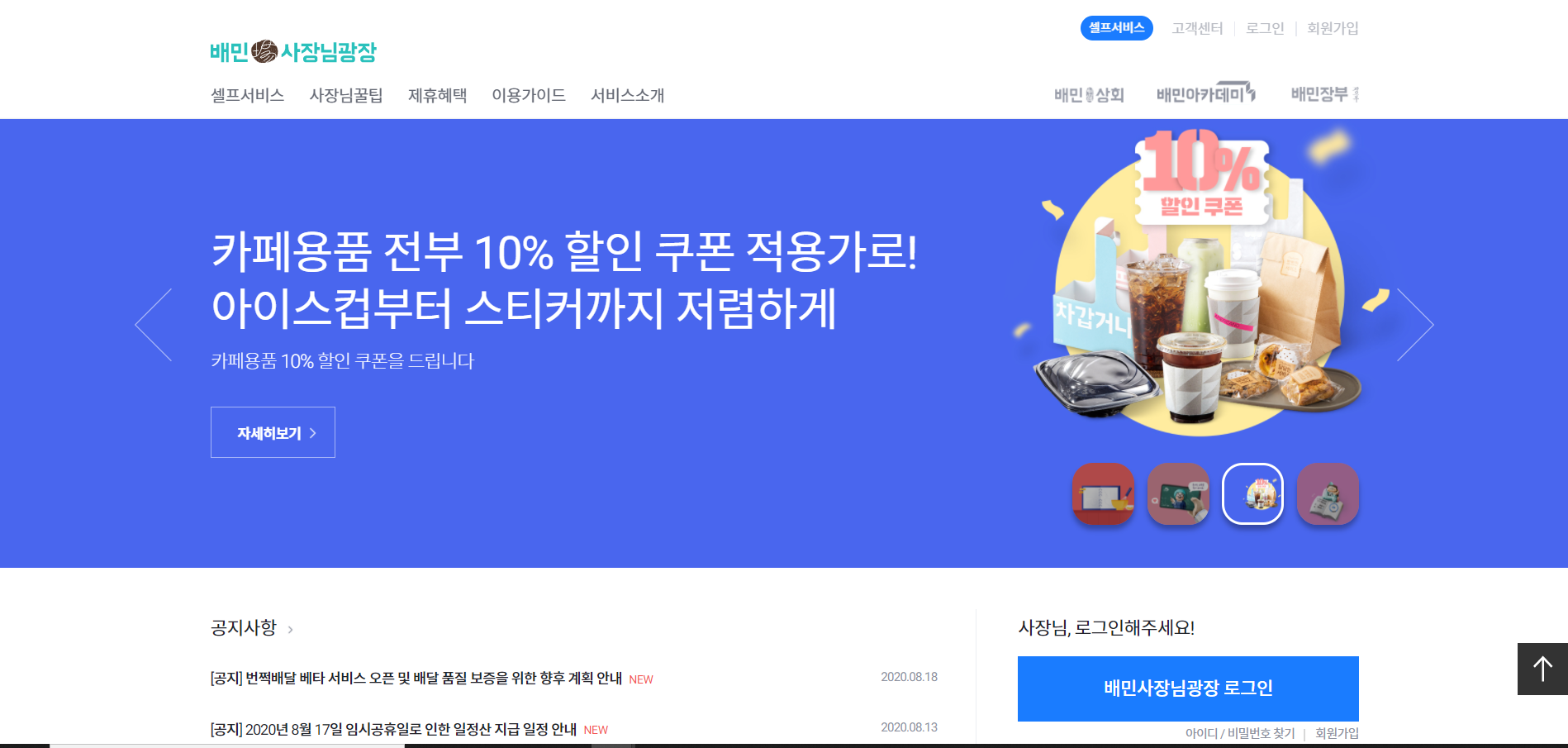 화면에서 보는것과 같이 배민사장님광장은 셀프서비스. 배민장부. 이용가이드. 제휴혜택. 배민아카데미. 배민상회