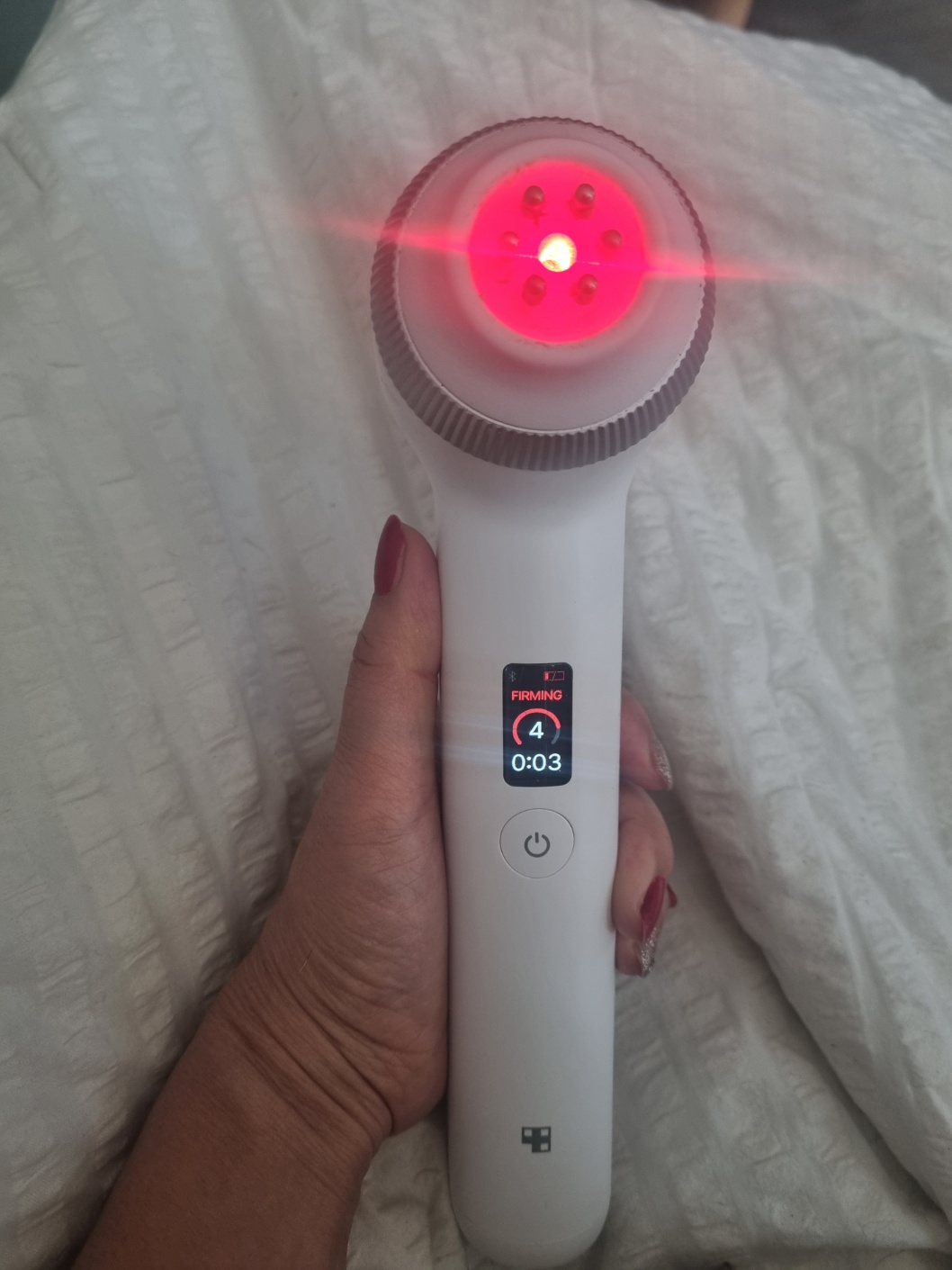 뚜껑을 열고 홈 버튼을 누르면 자동으로 5분 세팅 + 탄력 모드(붉은색) 시작!